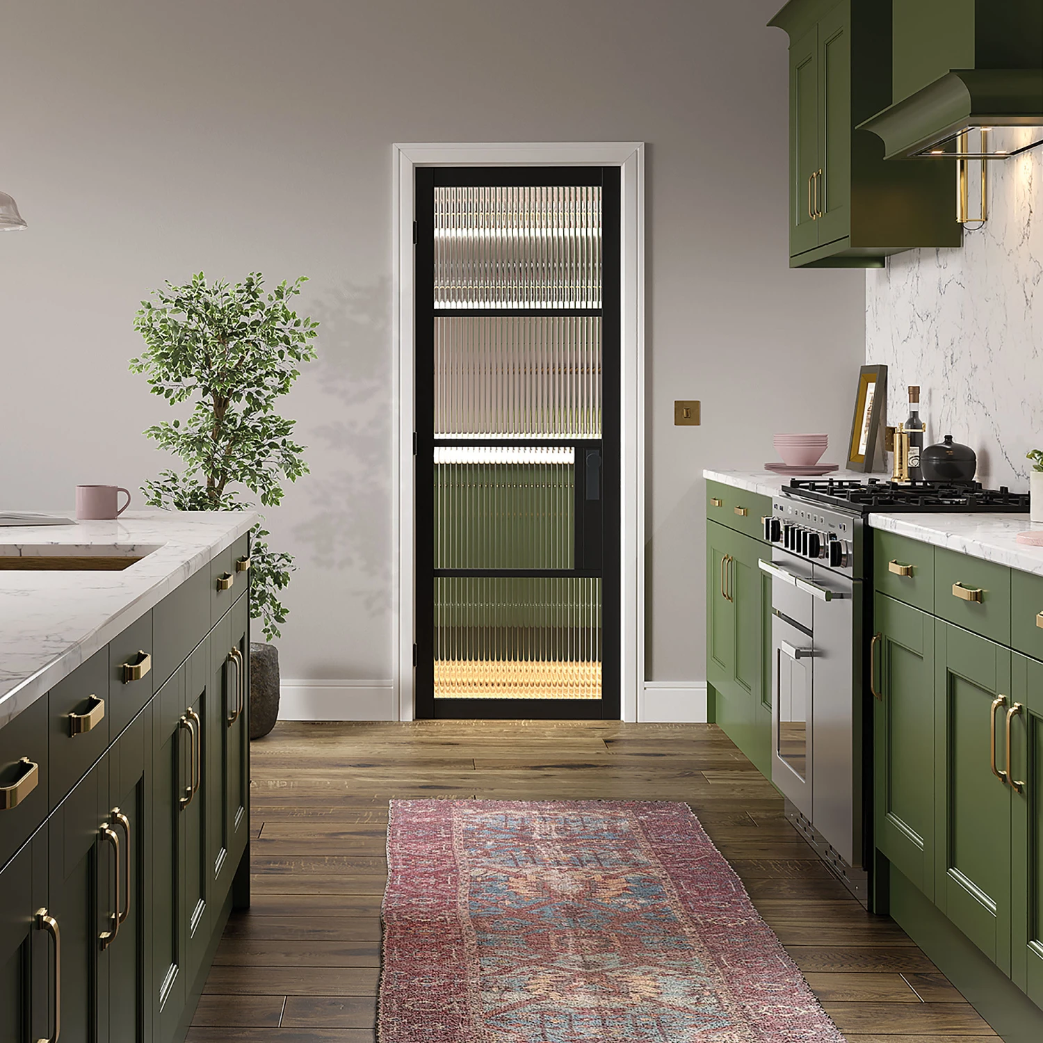 An amazing modern and industrial design with a retro twist. Featuring four generous reeded glazed panels, this door is ideal to let natural light flow throughout your home whilst also preserving your privacy. The textured glazing is shaped into semi-cylindrical adjacent mouldings to create the reeded pattern. Our first door to use reeded glazing, this will be a standout asset to your home. This internal door is constructed using sleek and slender primed plus black beading and a decorative lock block which is perfect for your matching accessories. Please note: this door must be paired with our Manhattan door hardware.