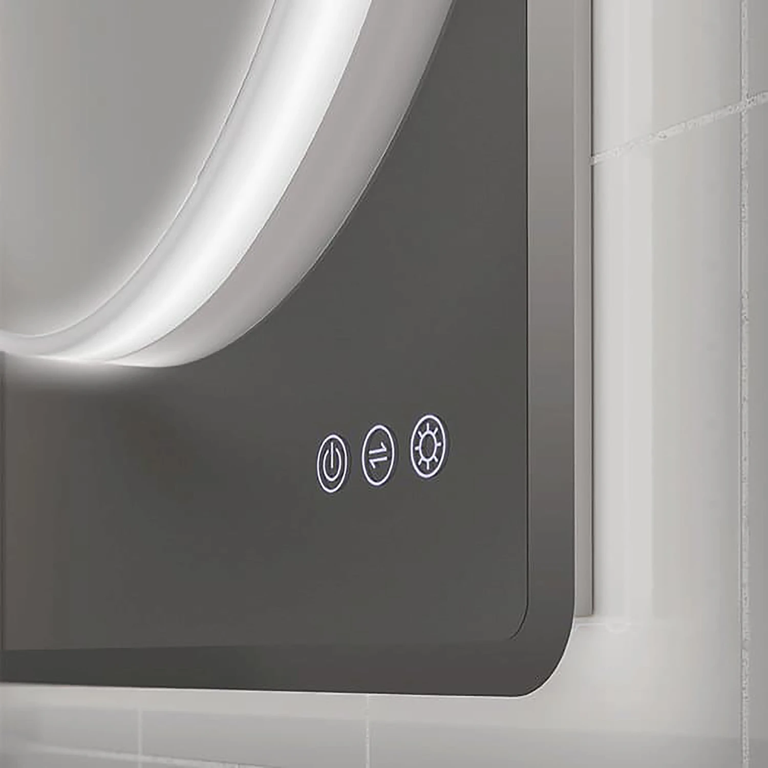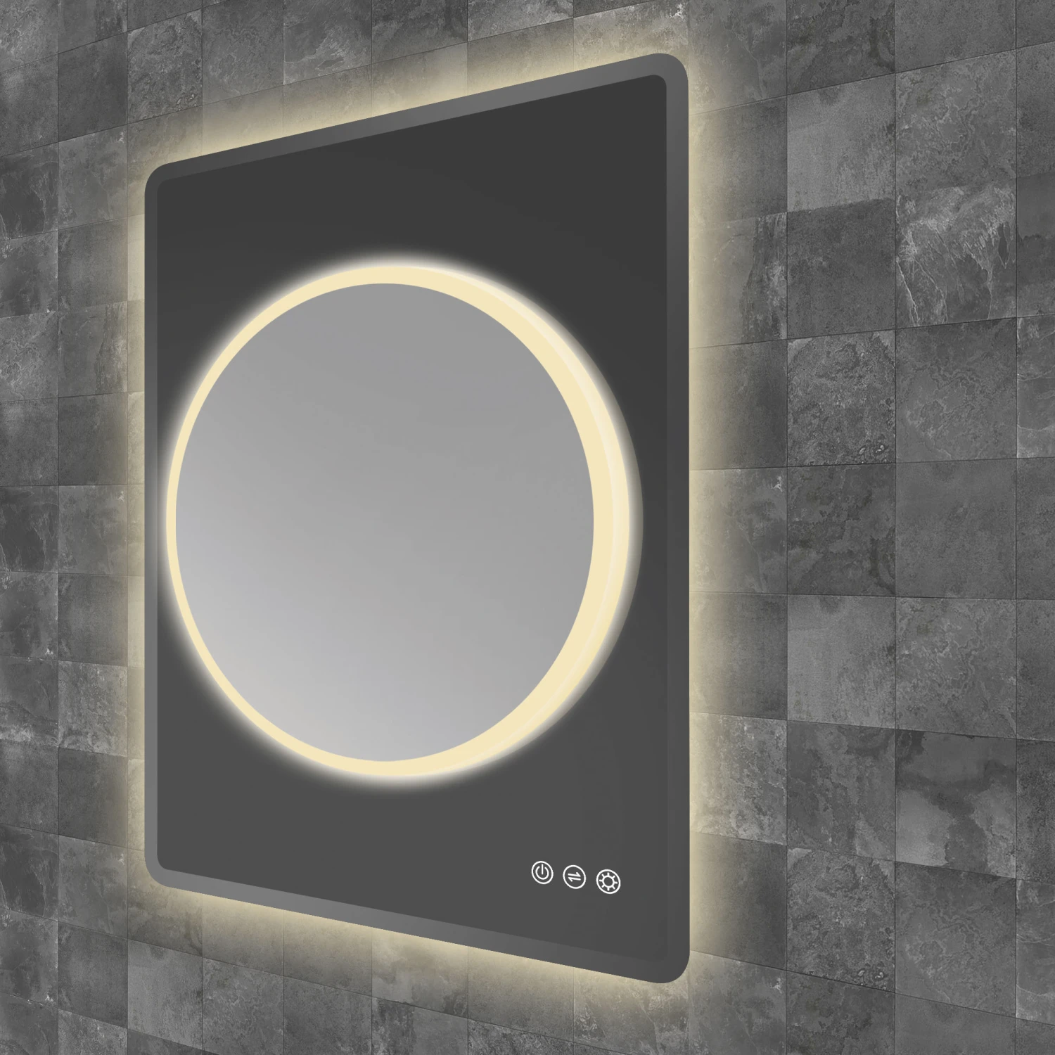 - Circular illuminated mirror mounted on smoked grey glass