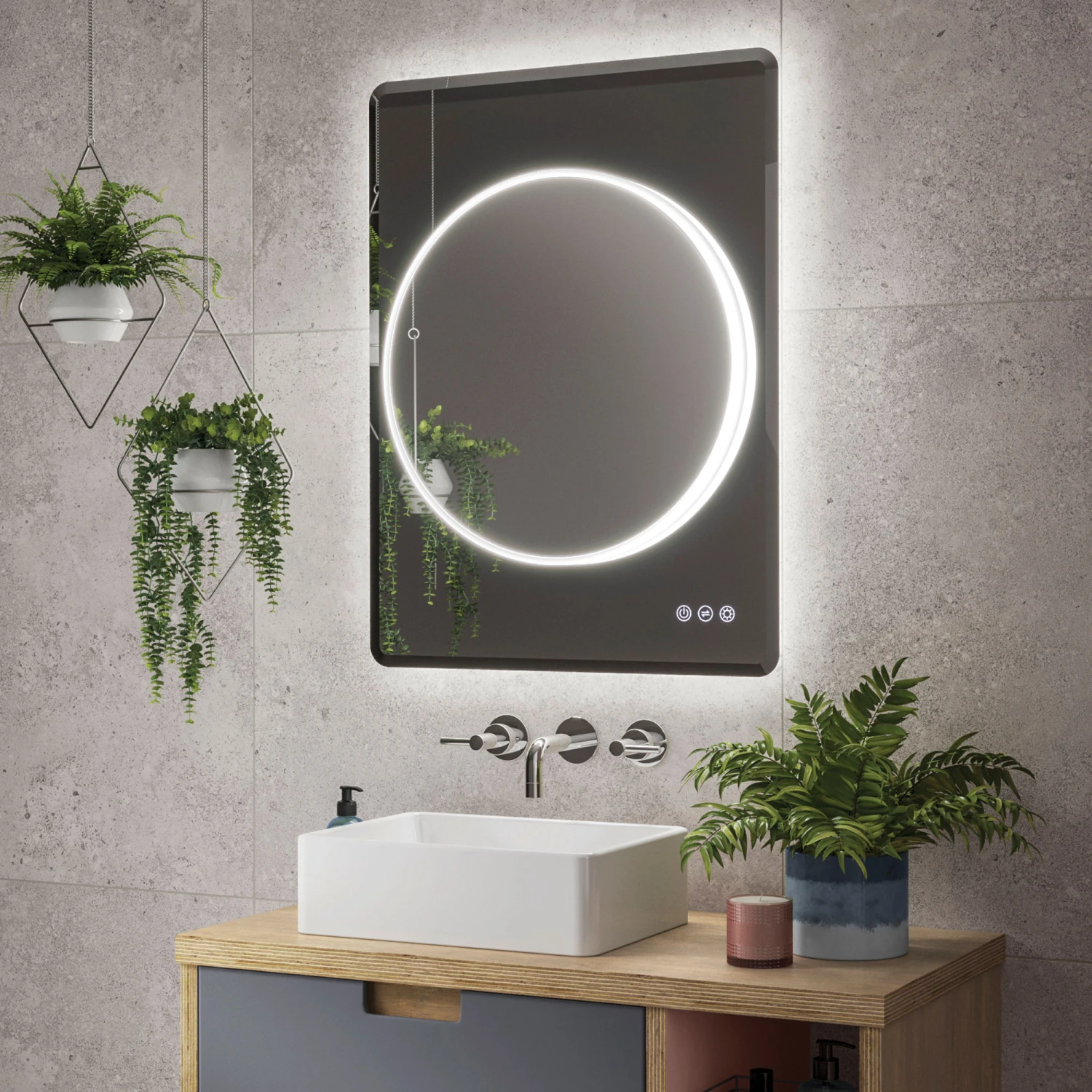 A sleek blend of light and shade, the HiB Frontier 60 impresses with a circular central mirror surrounded by a dimmable LED light against a contrasting smoked grey glass background. The colour temperature changing illumination is operated by simple touch controls on the front of the mirror, enabling fast switching between cool and warm white tones. The heated demister pad ensures the mirror stays streak- and steam-free.