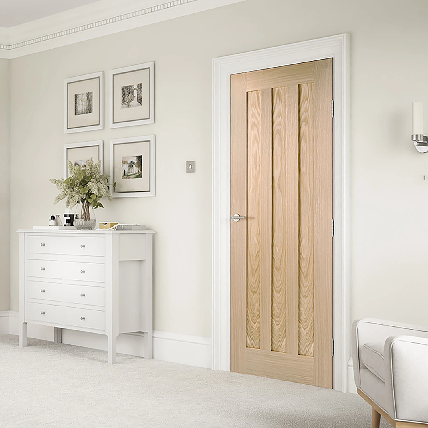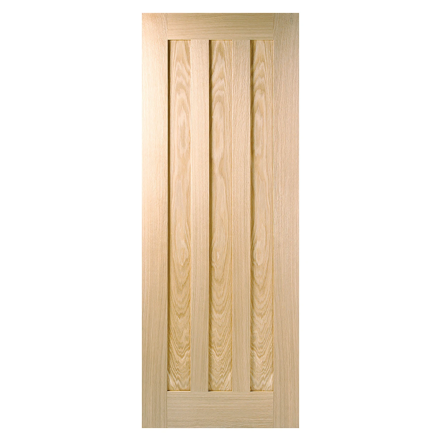 This modest and modern door design features three parallel centre panels in a subtle pre-finished Oak.