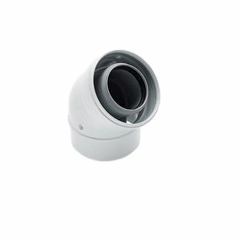 The Intergas 45 degree bend short radius elbow is a high quality bit of kit used for connecting pipes and altering the directing of the flue system. The white and grey finish gives a smart, sleek look whatever the job.