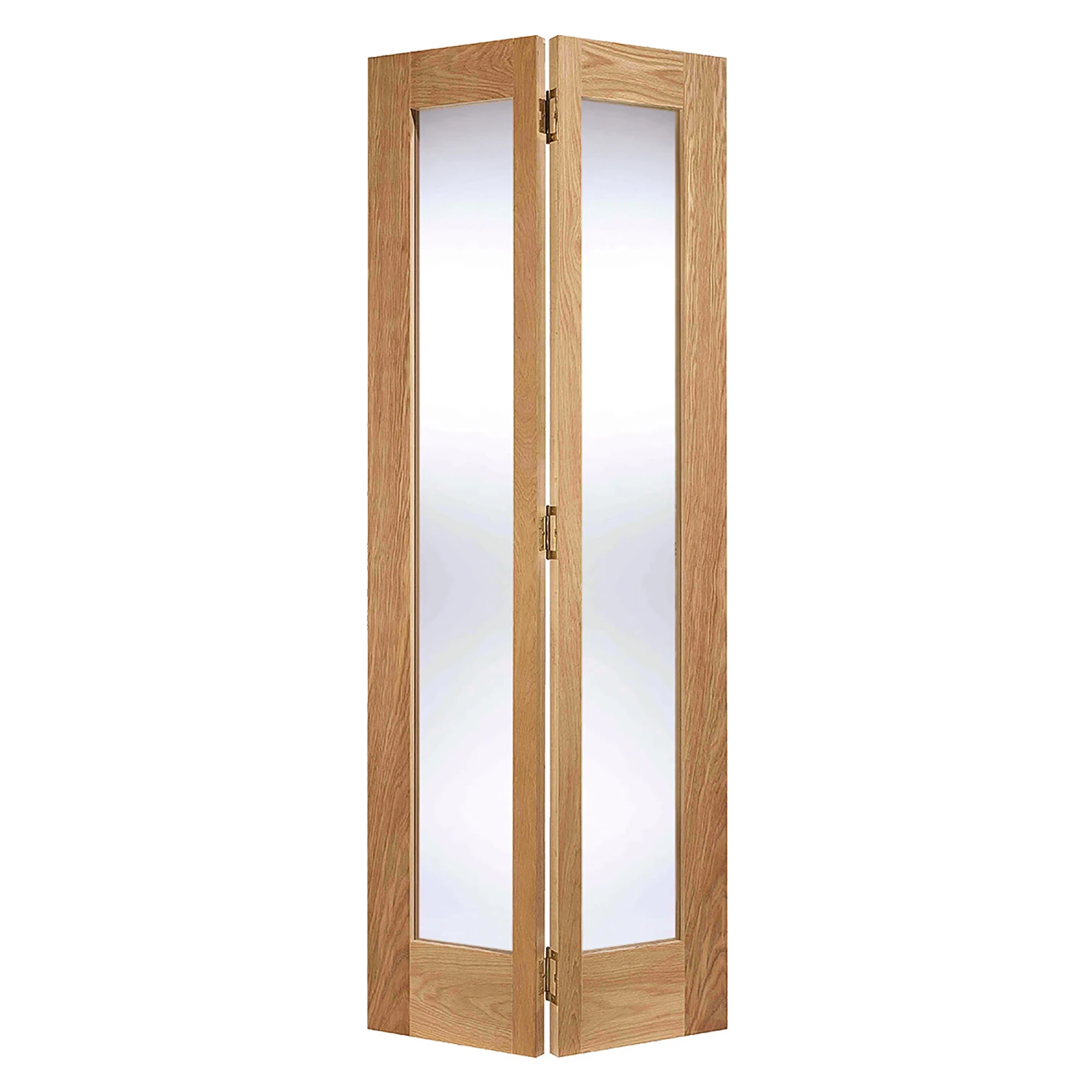A contemporary and convenient choice, this unfinished Oak door features vertical glazed panels with a bi-folding hinging. Please note 78″ height includes track. Supplied with track and hinges.